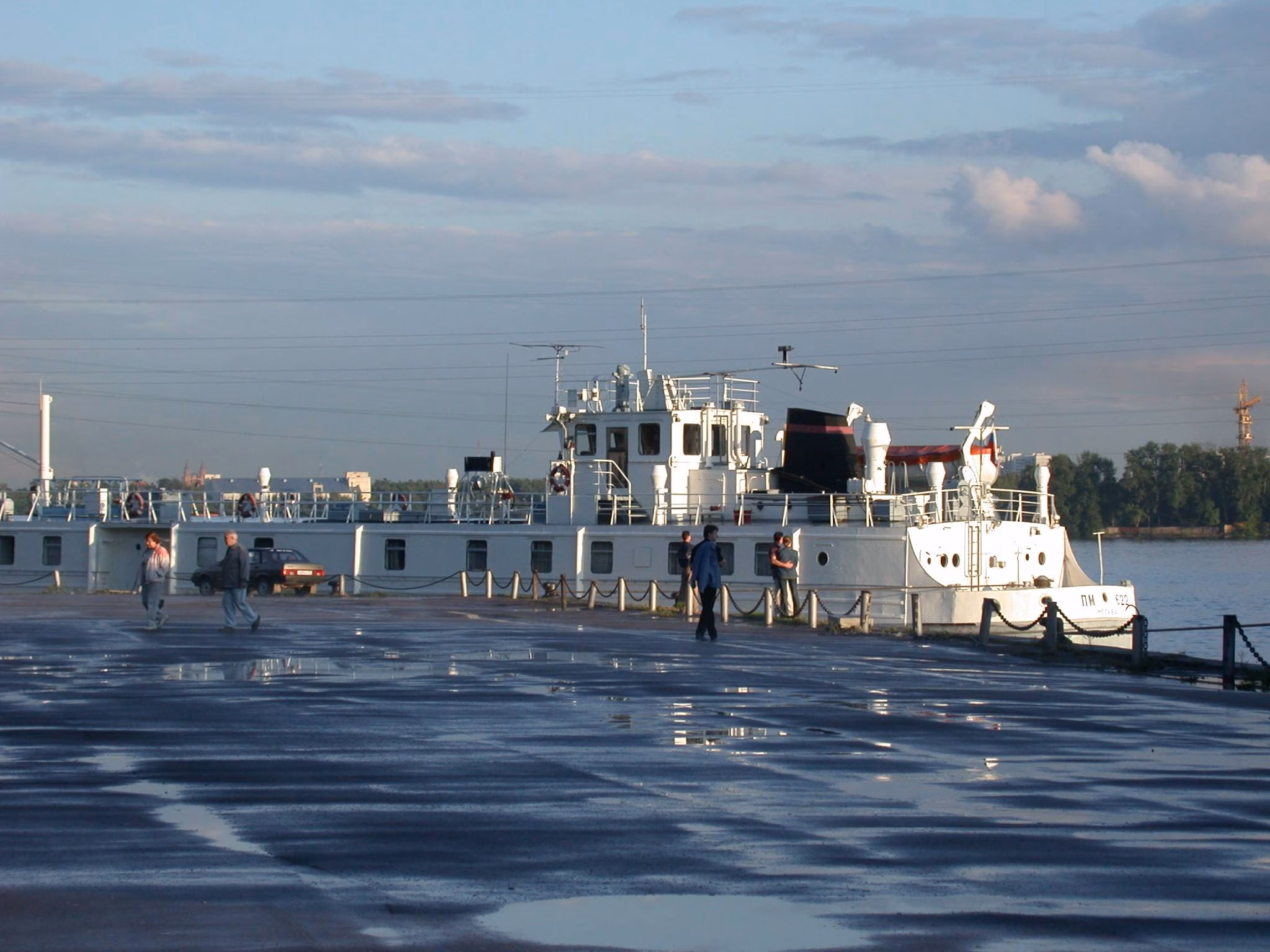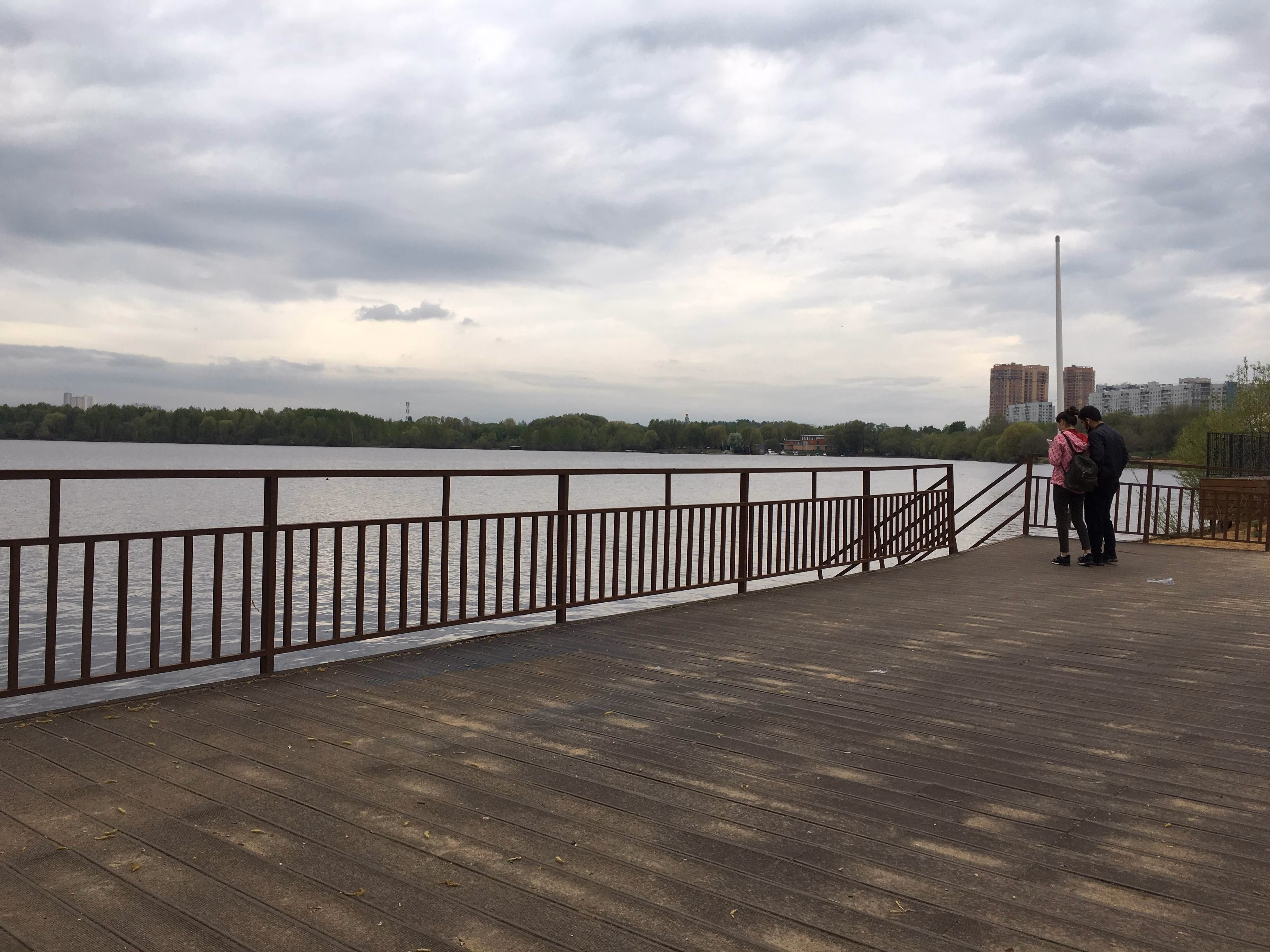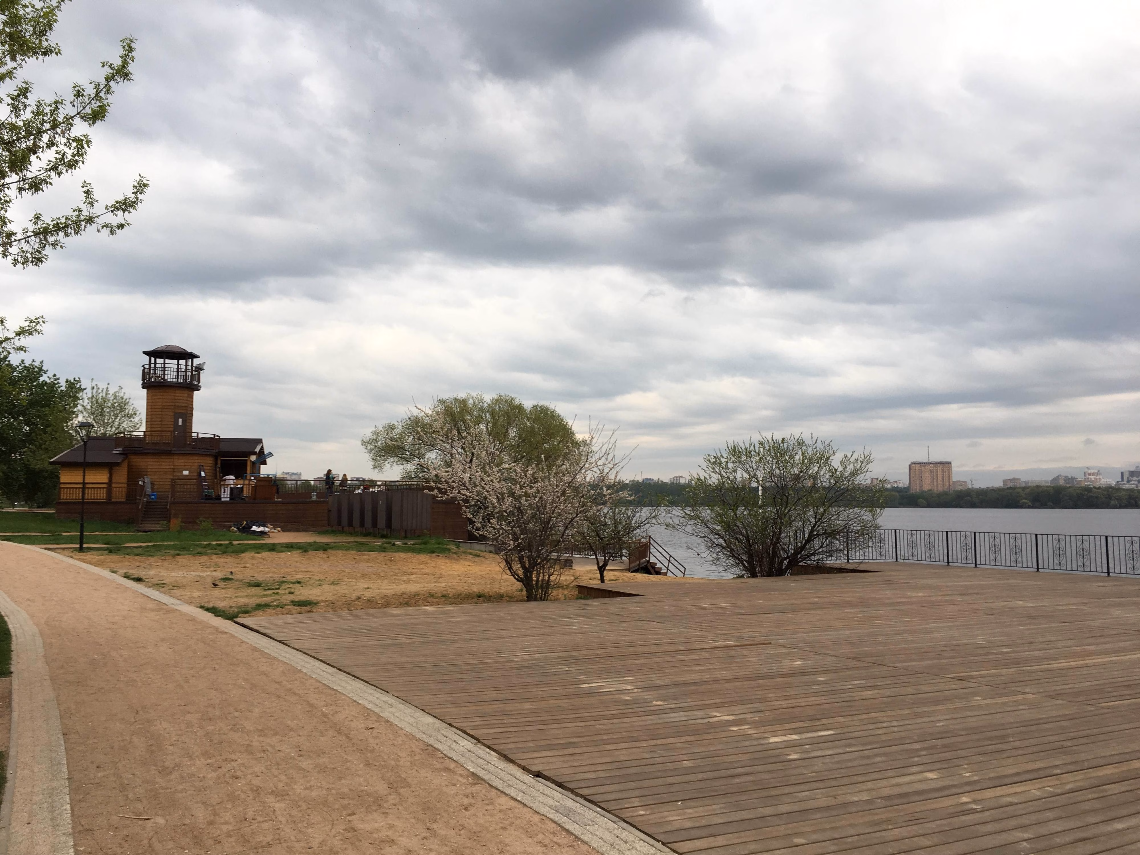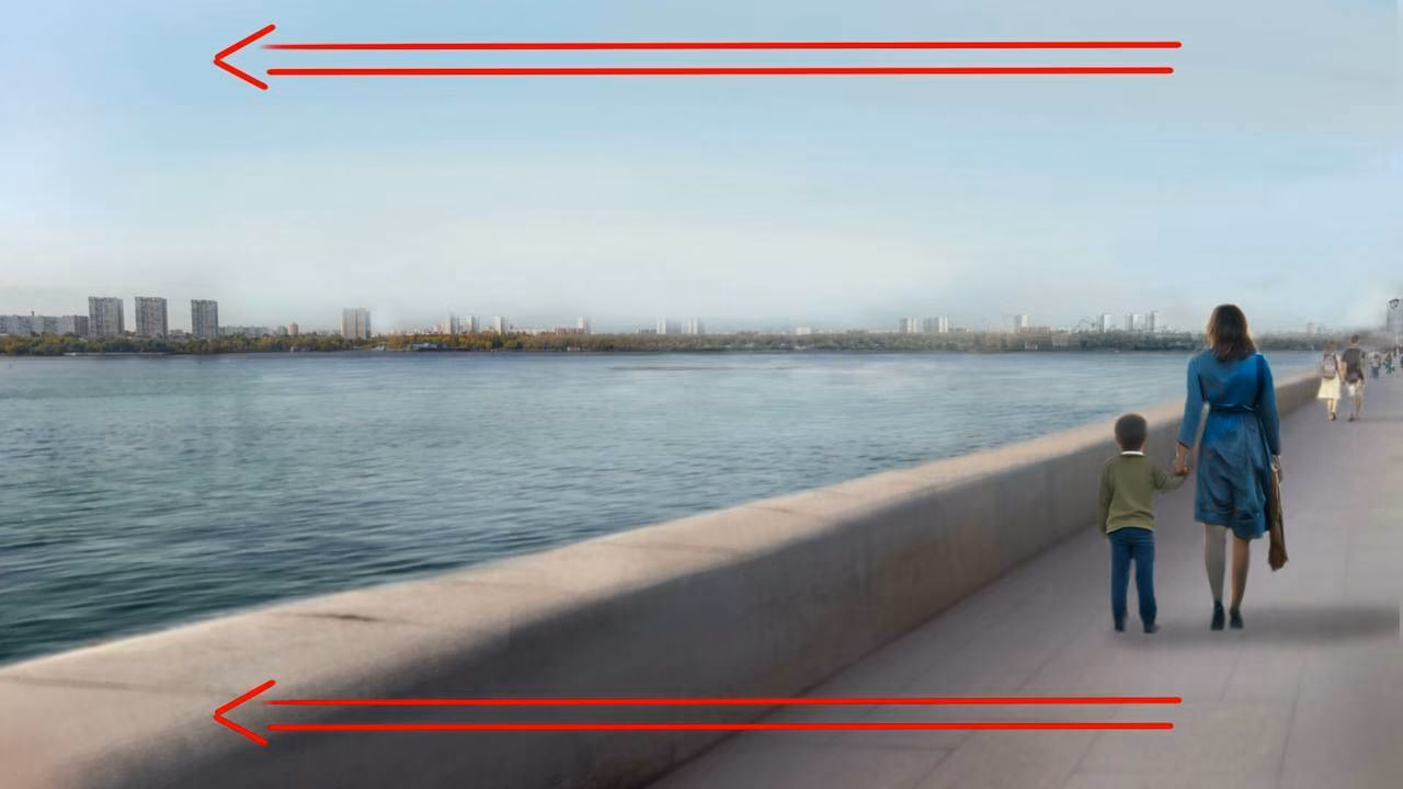 POV: Герой (камера) движется по набережной вдоль воды.