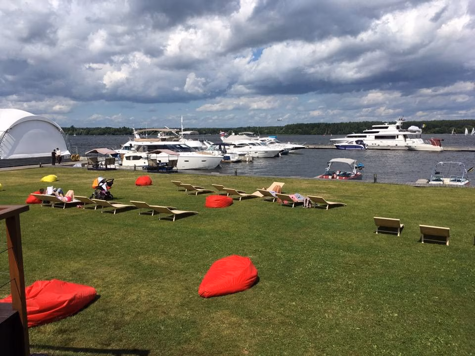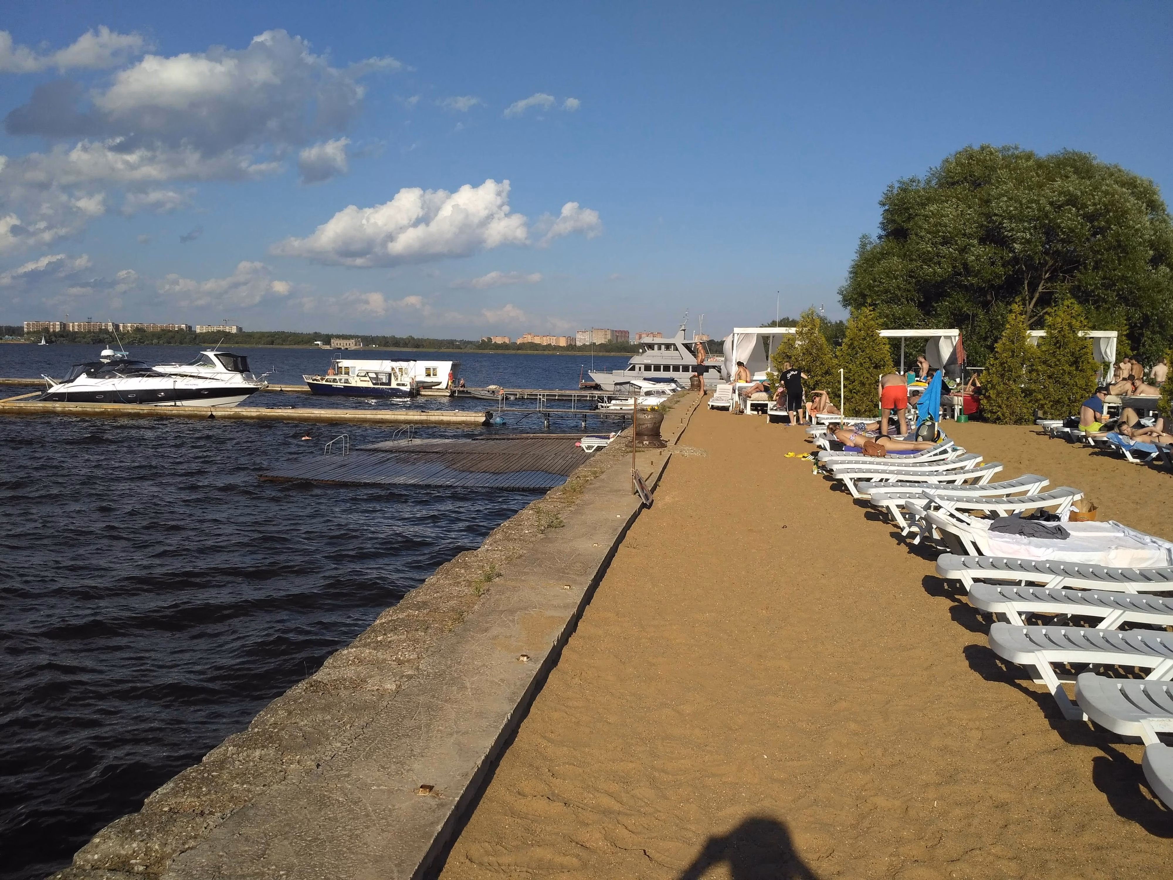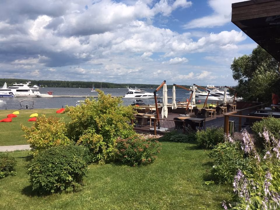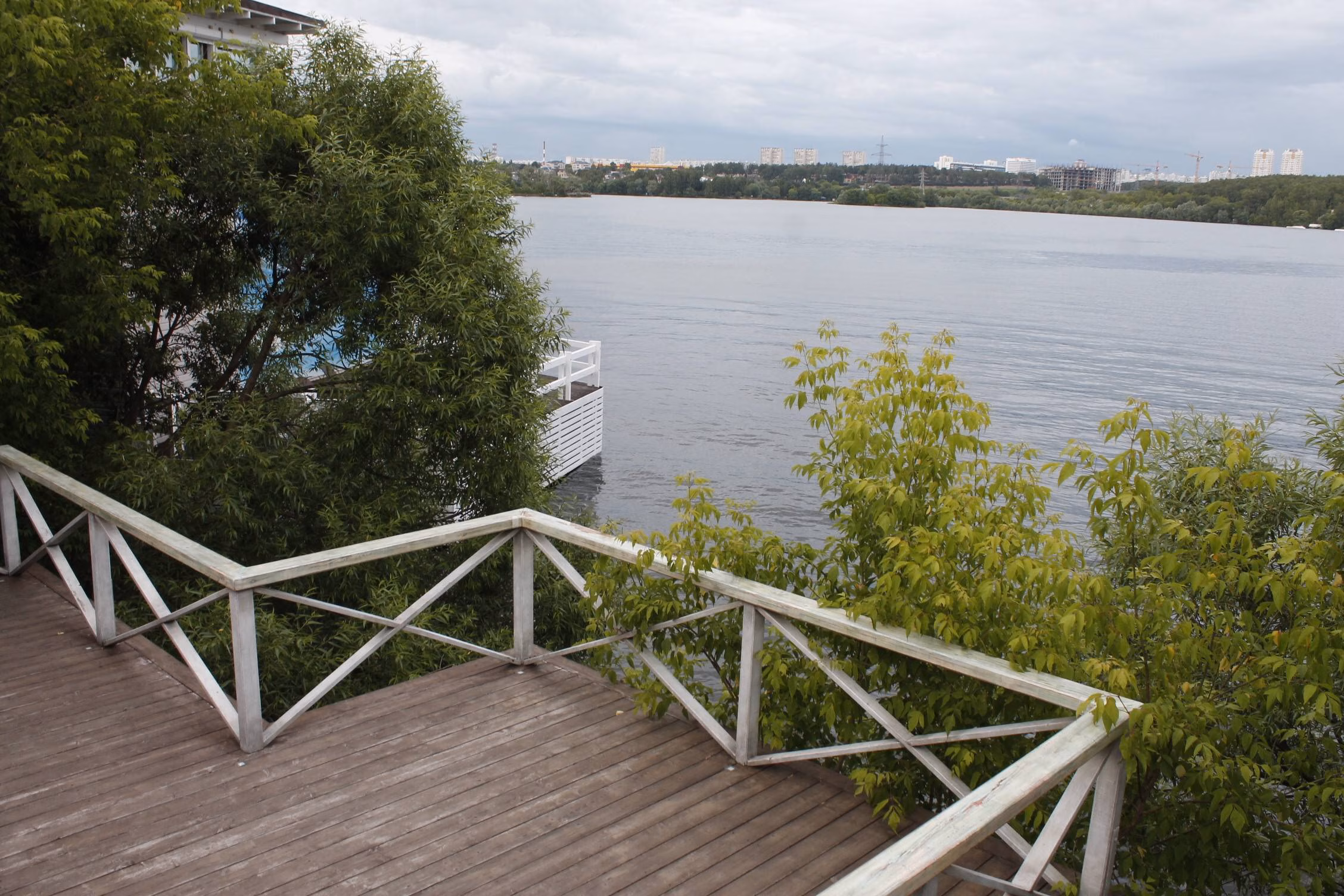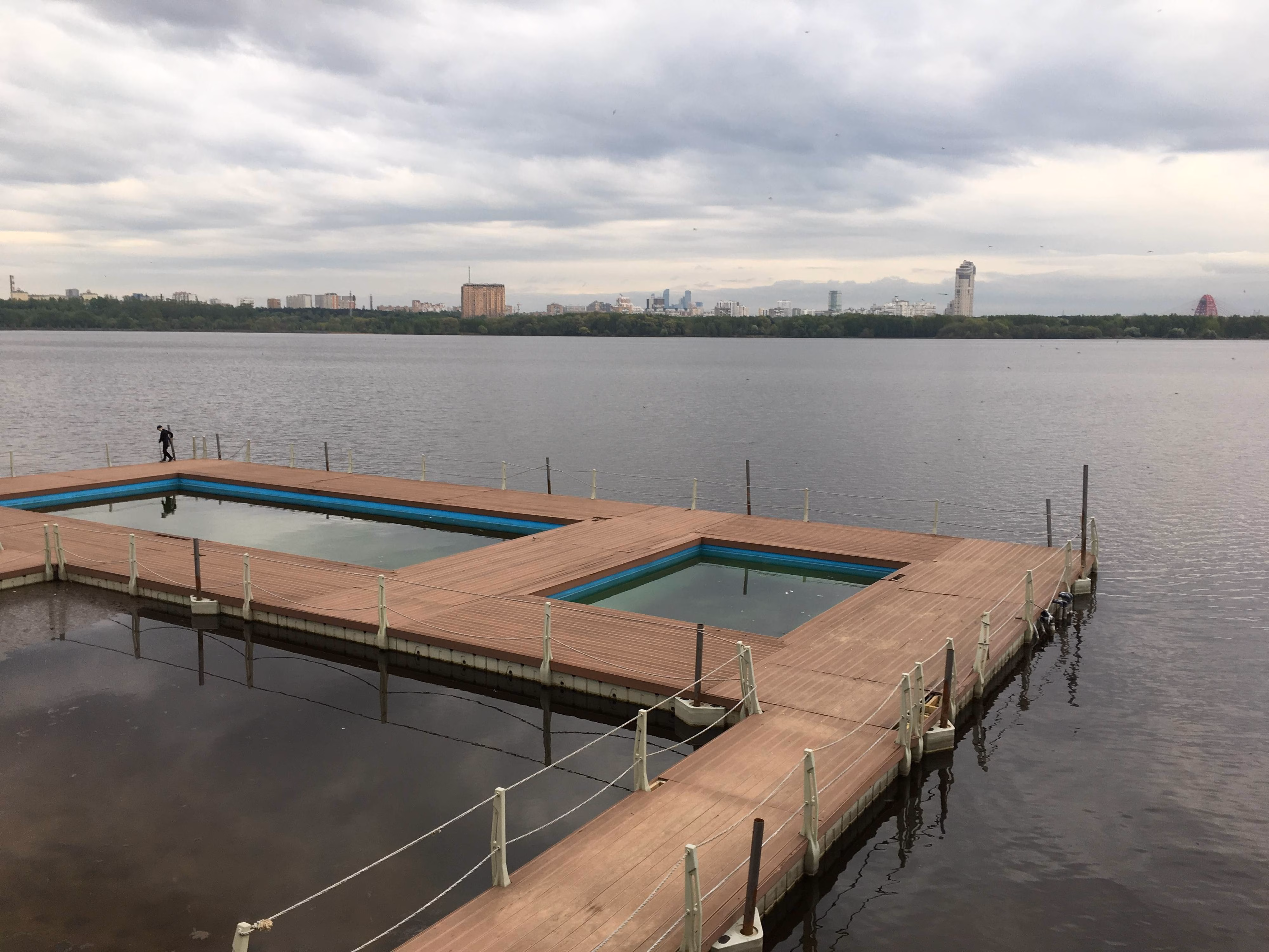 POV: Герой (камера) движется по набережной вдоль воды.