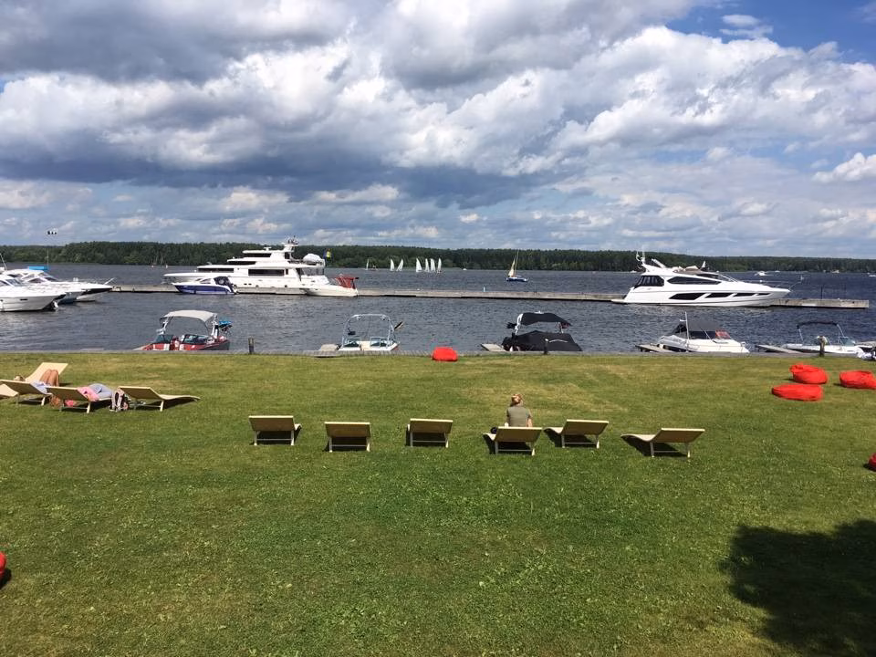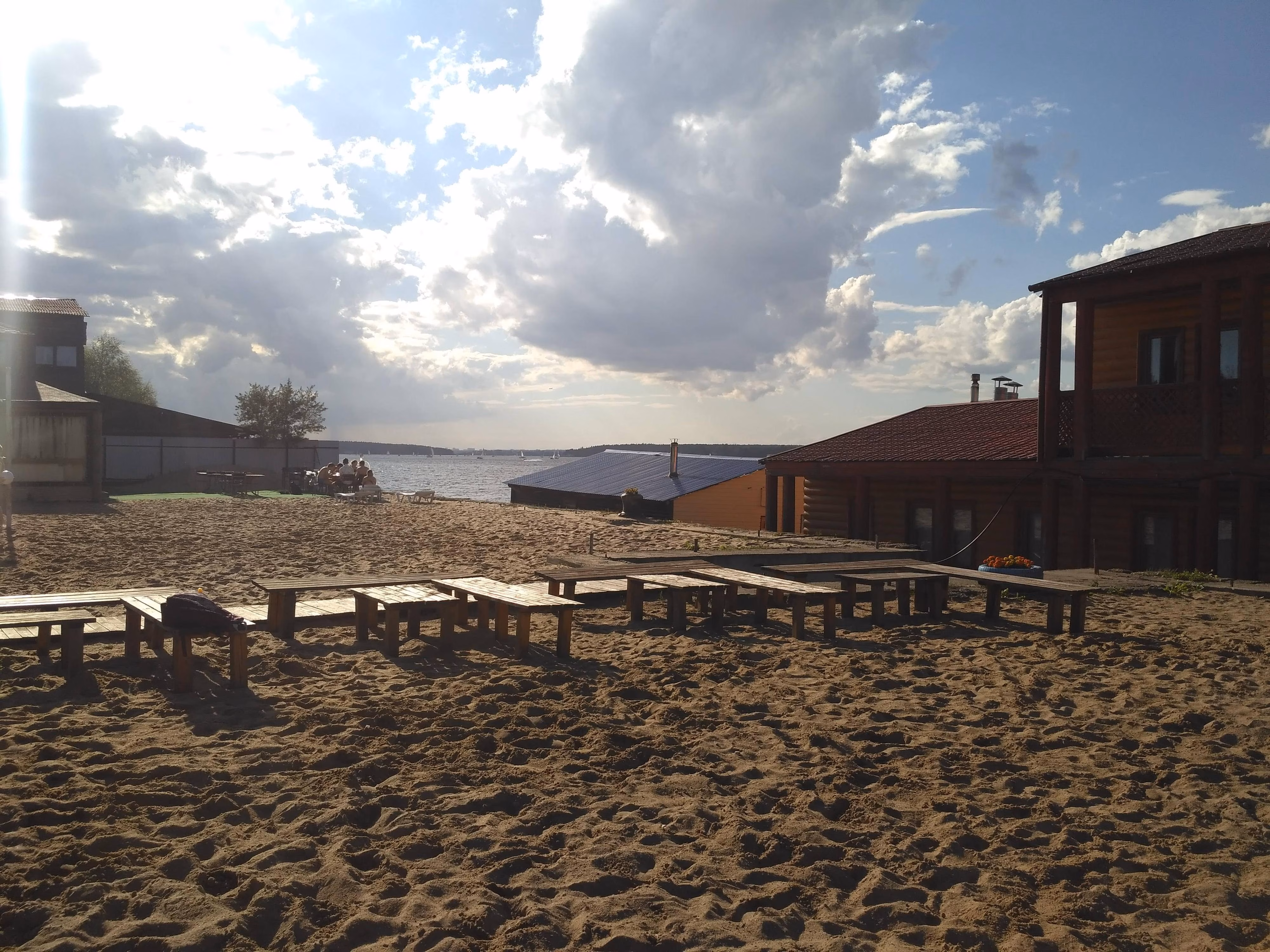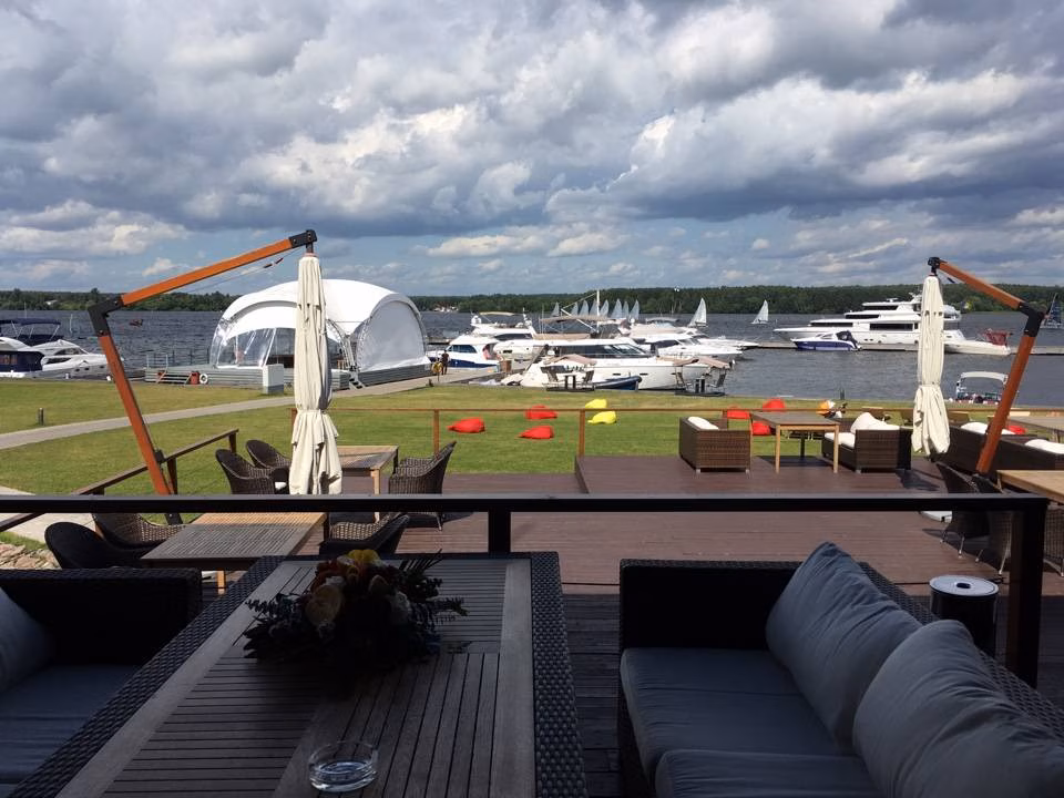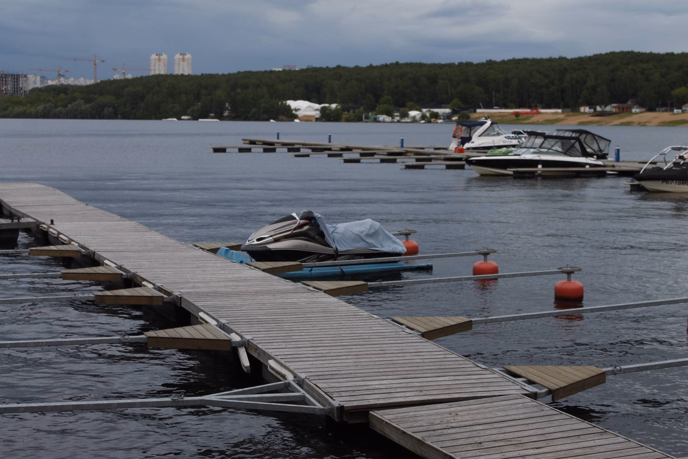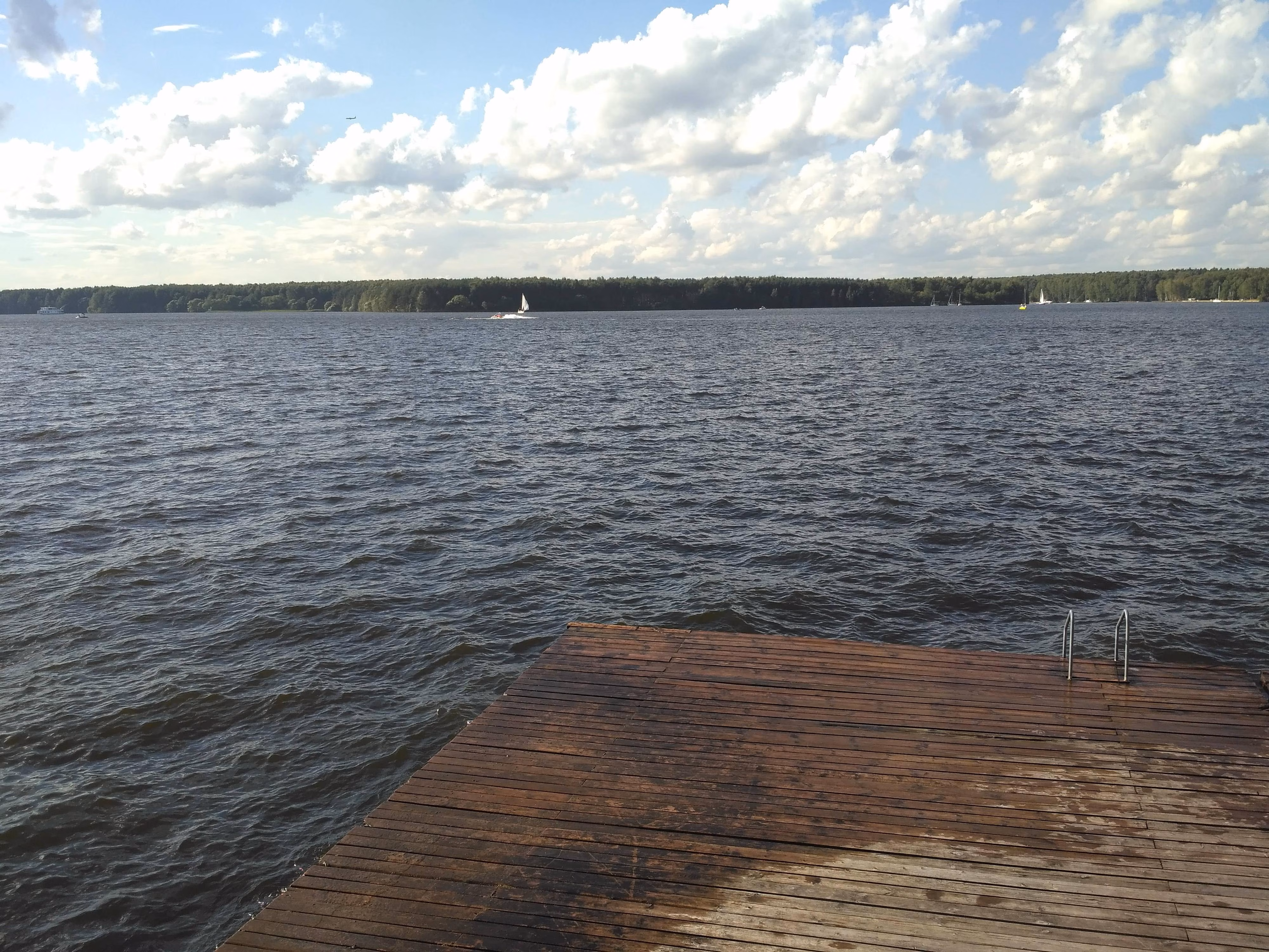 POV: Герой (камера) движется по набережной вдоль воды.