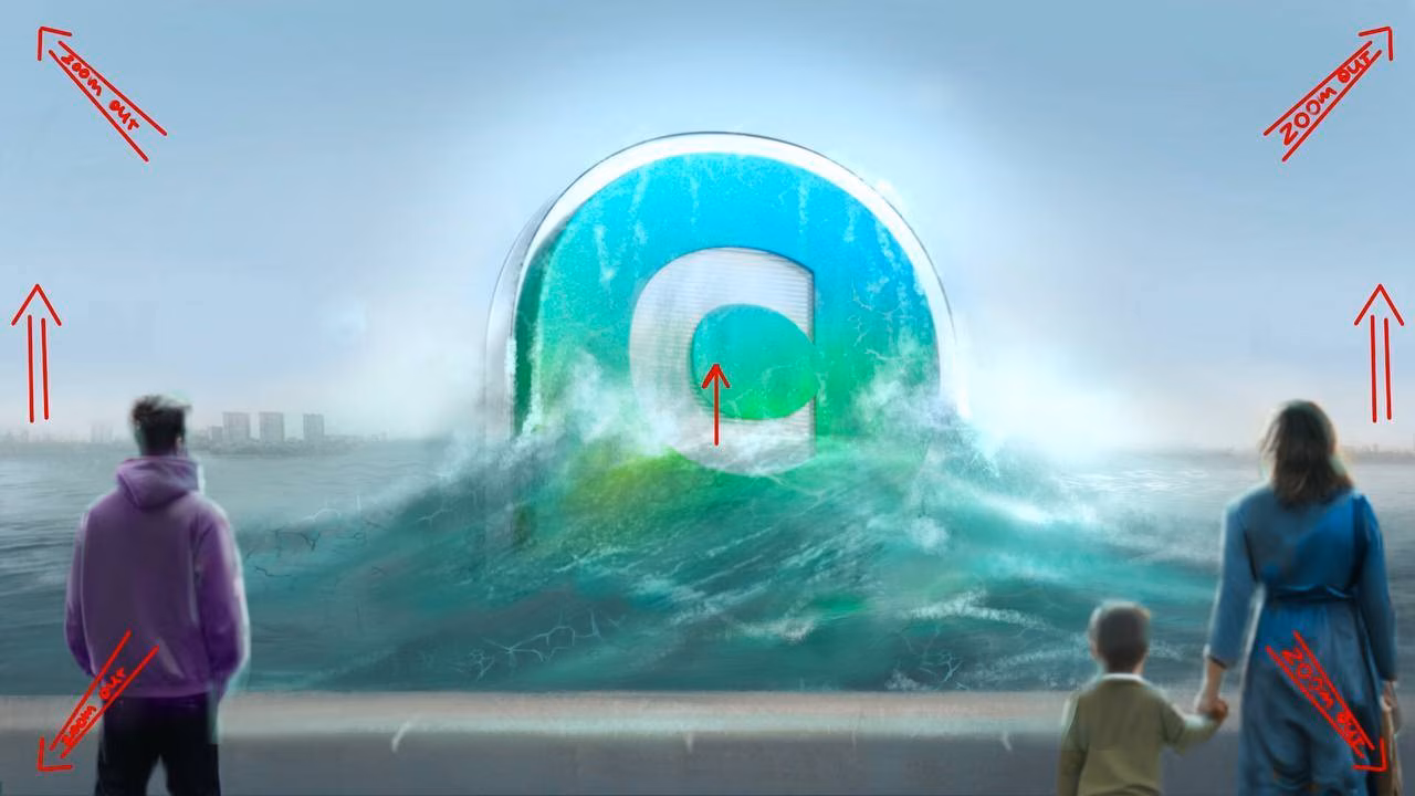 Объект неспешно поднимается, с него льется вода, все вокруг бурлит. Зритель узнает в объекте огромный логотип «Спасибо». Взгляд поднимается за объектом.