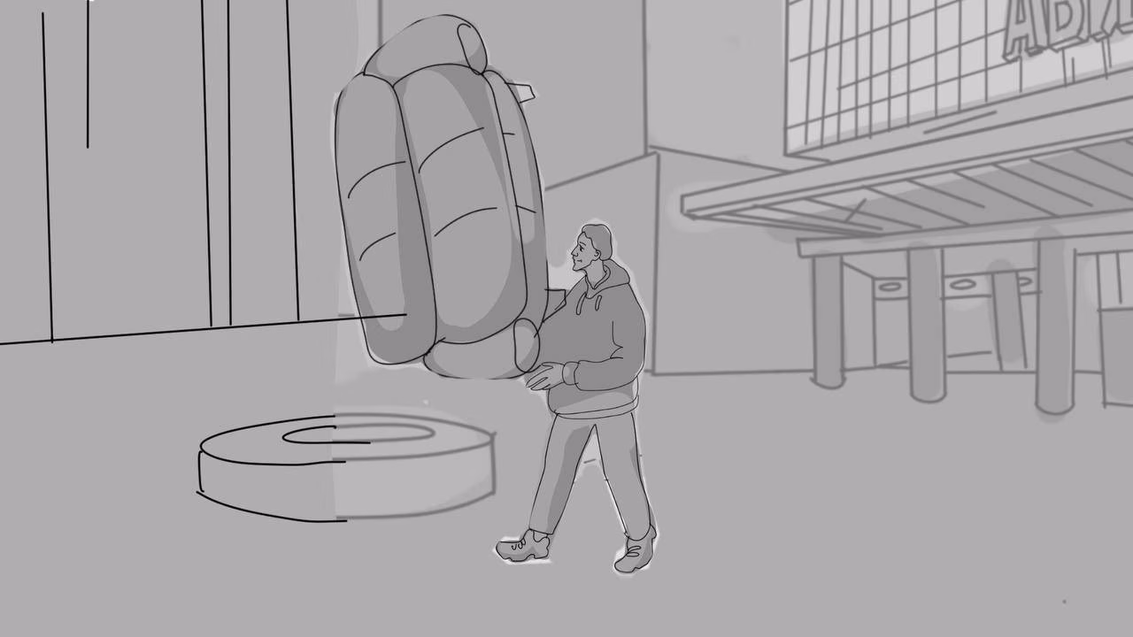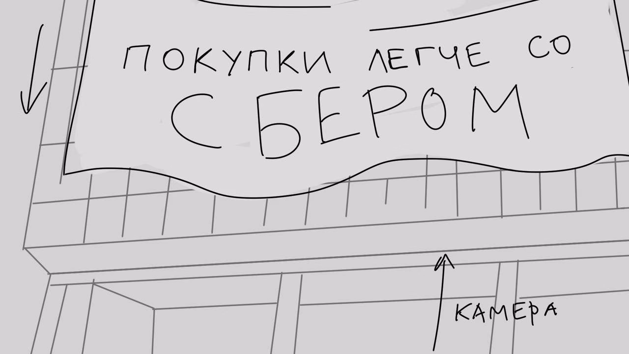 POV.​ Камера снимает входную группу торгового центра,​ мы видим человека с диваном в руках,​ он держит его над головой,​ двигаясь от входа тц,​ выходит из кадра.​ Идет девушка с холодильником,​ за ней выходят люди с большим шкафом,​ массажным креслом,​ велосипедом.​ Все эти большие товары люди несут одной рукой,​ с легкостью.​ Камера провожает взглядом предпоследнего человека и оборачивается на билборд,​ где видит информацию о кредите.​ Логошот.​